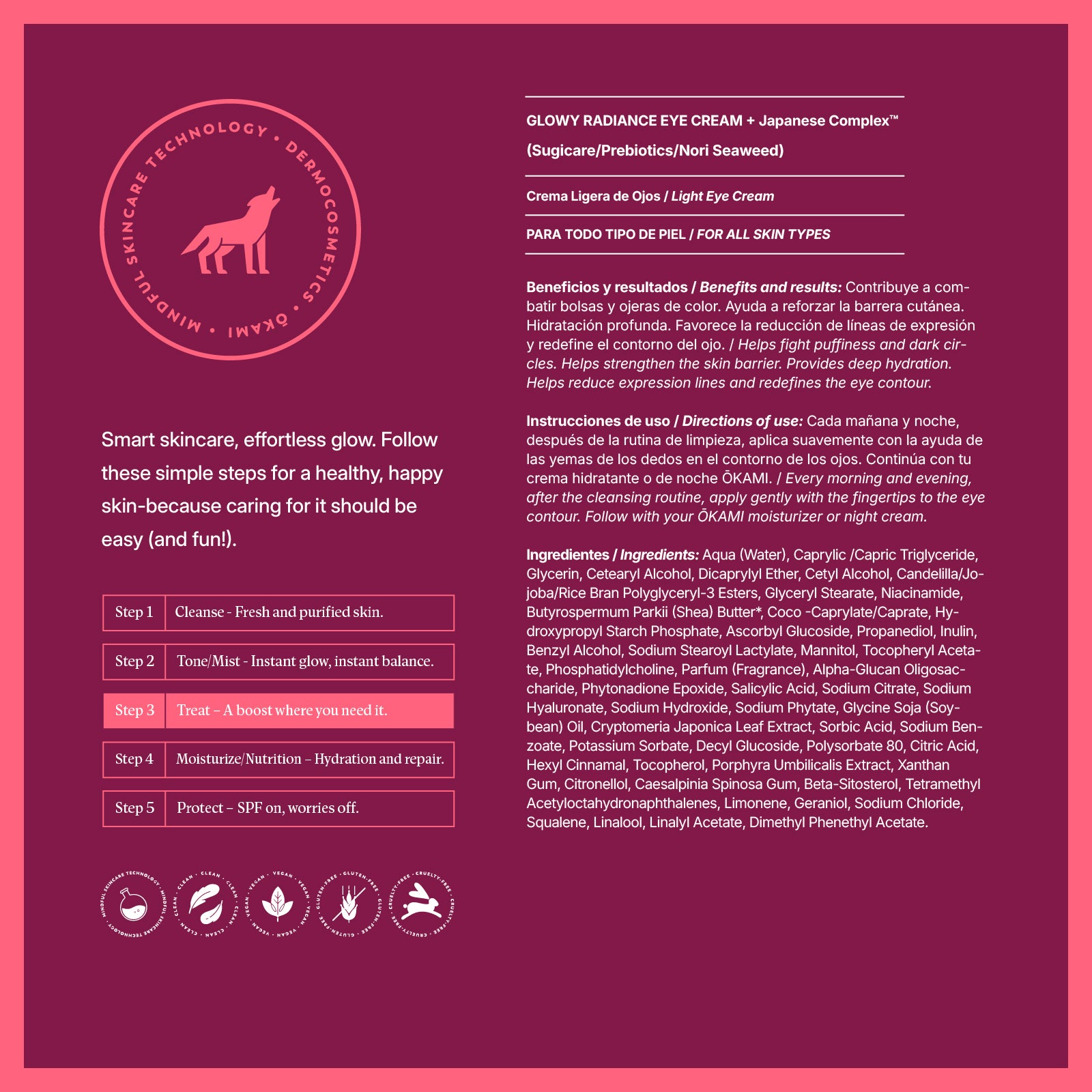 Cada mañana y noche, después de la rutina de limpieza, aplica suavemente con la ayuda de las yemas de los dedos en el contorno de los ojos. Continúa con tu crema de día o de noche ŌKAMI.