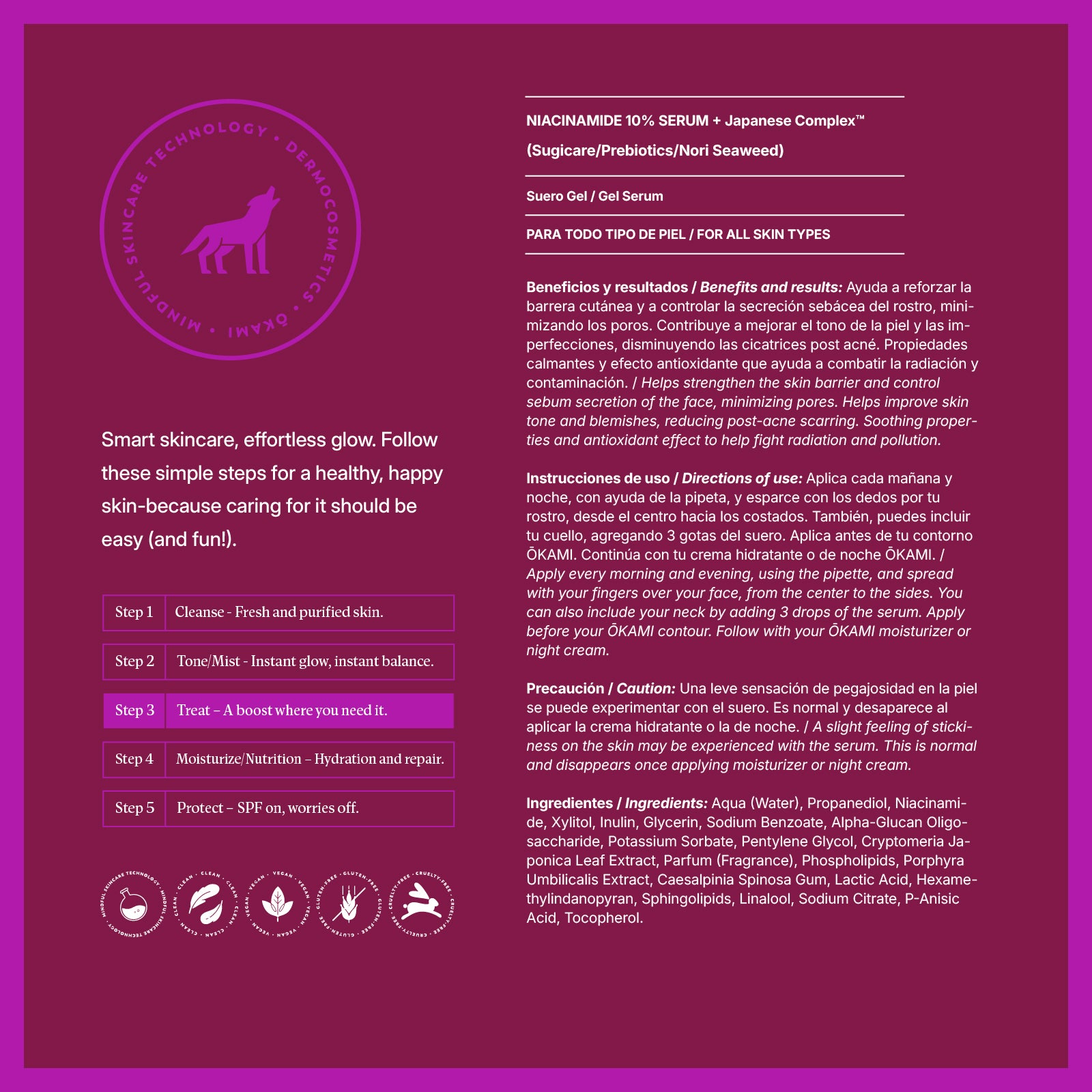 Aplica cada mañana y noche en la palma de tu mano, 2 gotas con ayuda de la pipeta y esparce en tu rostro desde el centro hacia los costados. También, puedes incluir tu cuello, agregando 1 gota del suero. Aplica antes de tu contorno ŌKAMI. Continúa con tu crema de día o de noche ŌKAMI.